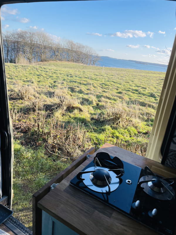 11.2.22 Bevor wir die Staatsgrenze von Dänemark passierten, tankten wir nochmal voll und füllten unsere Vorräte auf. Wir tuckerten so los und kamen rasch ohne Zwischenfälle nach Dänemark. Da wir die Brücken in Richtung Schweden erst am nächsten Tag passieren wollten machten wir auf einem kleinen Schotterparkplatz auf einer Anhöhe Stopp und konnten bei strahlendem Sonnenschein und frischem Wind einen wunderbaren Ausblick genießen. Es gab auch einen Rundweg den wir sobald auf uns nahmen. Am Meer entlang, ein paar Anhöhen hoch, durch einen Wald und zurück zur Emma, wo es an diesem Abend, Fisch an Mais mit zerstoßenen Kartoffeln, gab.