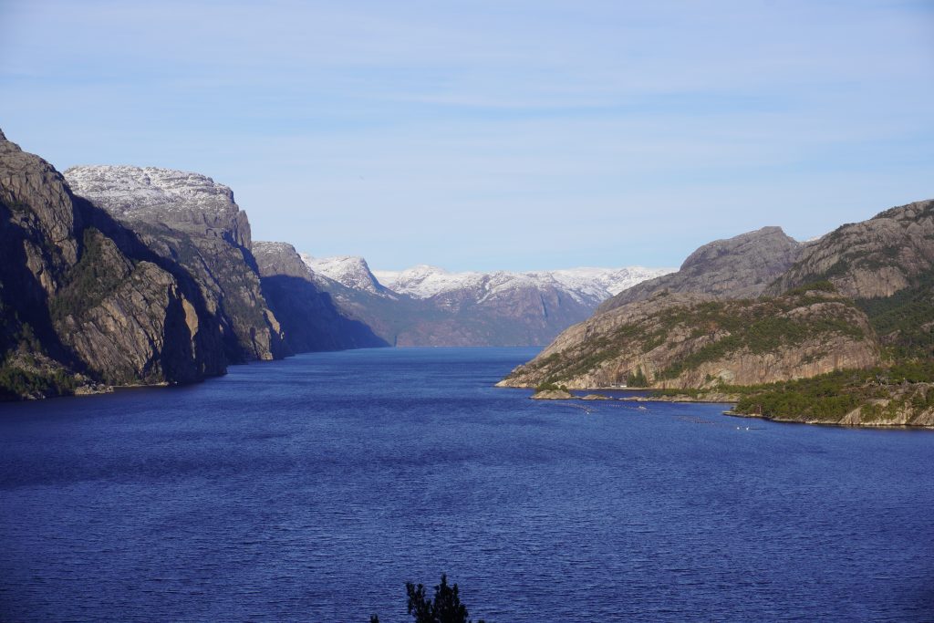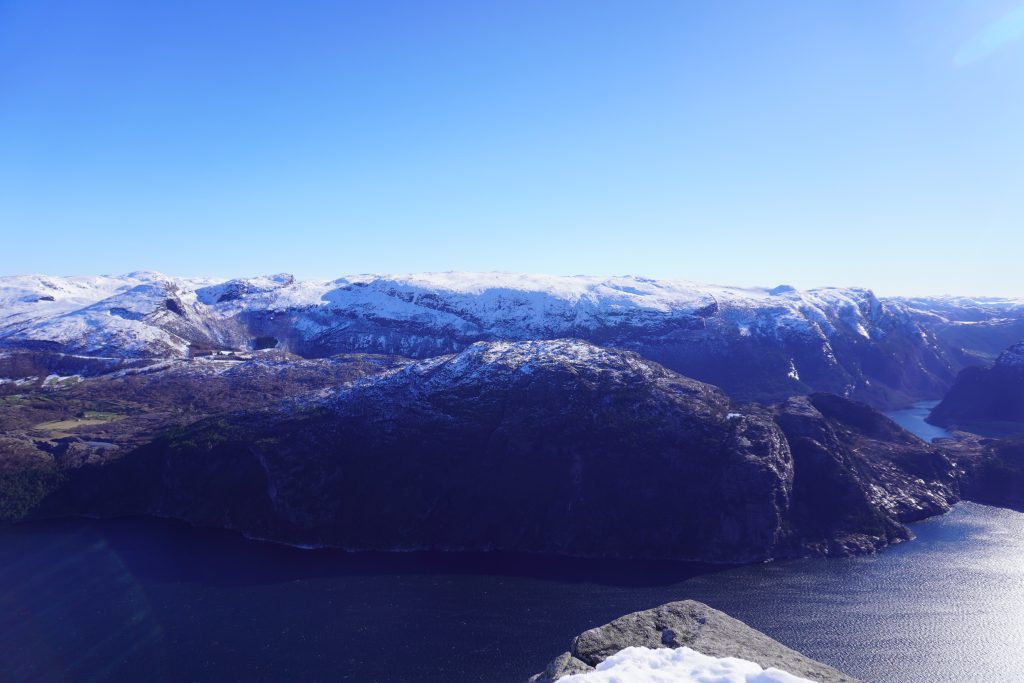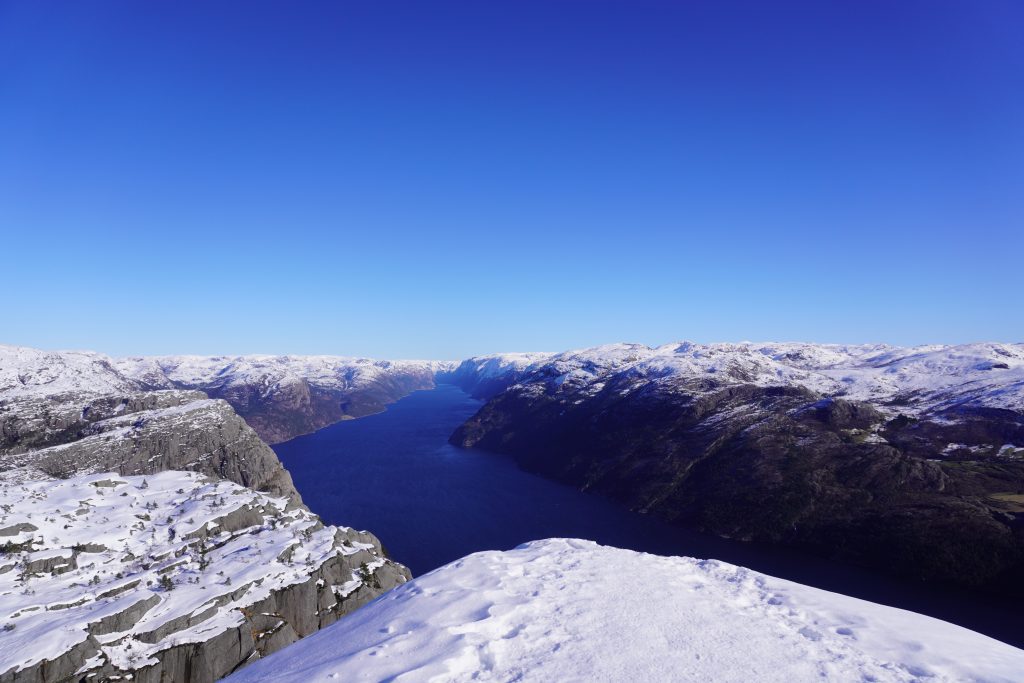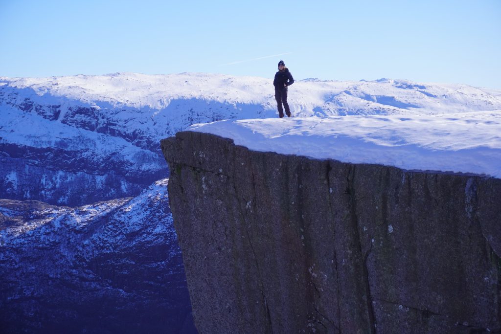 So oder so ähnlich könnte man den Wanderweg zu dem Preikestolen beschreiben. Dieser Weg hat es in sich, man läuft eigentlich „nur“ 4 km, diese schlängeln sich aber immer nur steil bergauf Richtung Himmel. Wir wanderten durch den Schnee mit Spikes an den Füßen immer höher, genossen die Aussicht und die Sonne. Urplötzlich fiel der Hang vor uns schroff 604 Meter in die Tiefe, wir waren ganz oben angekommen. Und da standen wir hoch oben über dem glitzernden Lysefjord. Was ein Spektakel!