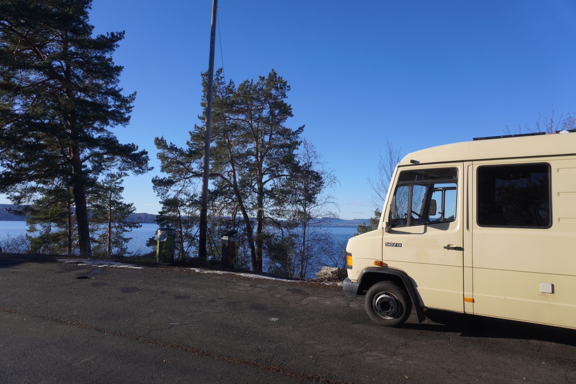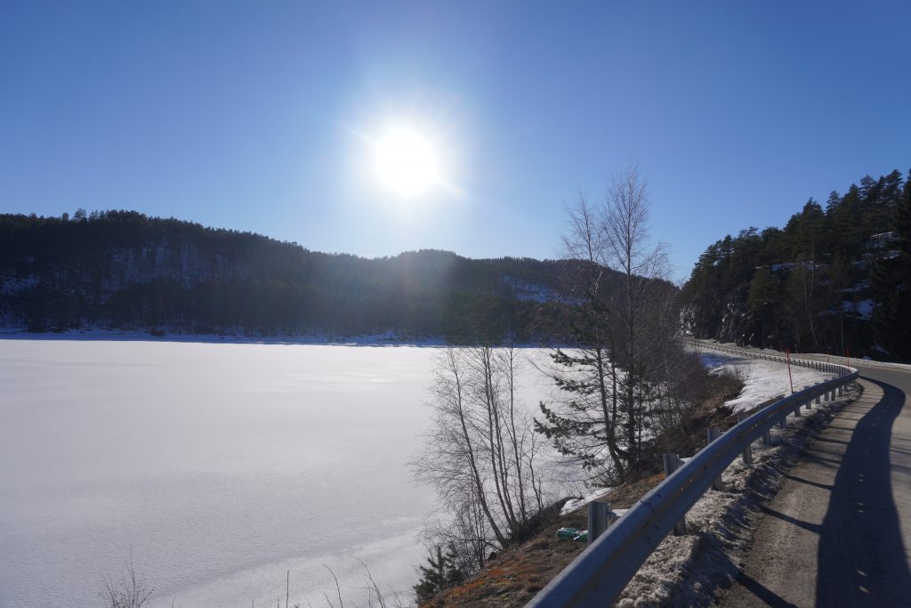 2.3.22 Im Sonnenschein fuhren wir von Arendal los und legten einiges an Kilometer zurück. Ein unglaubliches Panorama reihte sich an das nächste, ein im Schnee glitzernder Bergsee an Birkenwälder. Die dicke Emma hatte gut zu kämpfen, aber sie meisterte jeden einzelnen Hügel. Zwar langsam, aber stetig. Und die Aussicht macht alles wett. Noch in der warmen Sonne kamen an unserem Schlafplatz an, der an einem See gleich neben der „Fjotland Kirke“ lag.
