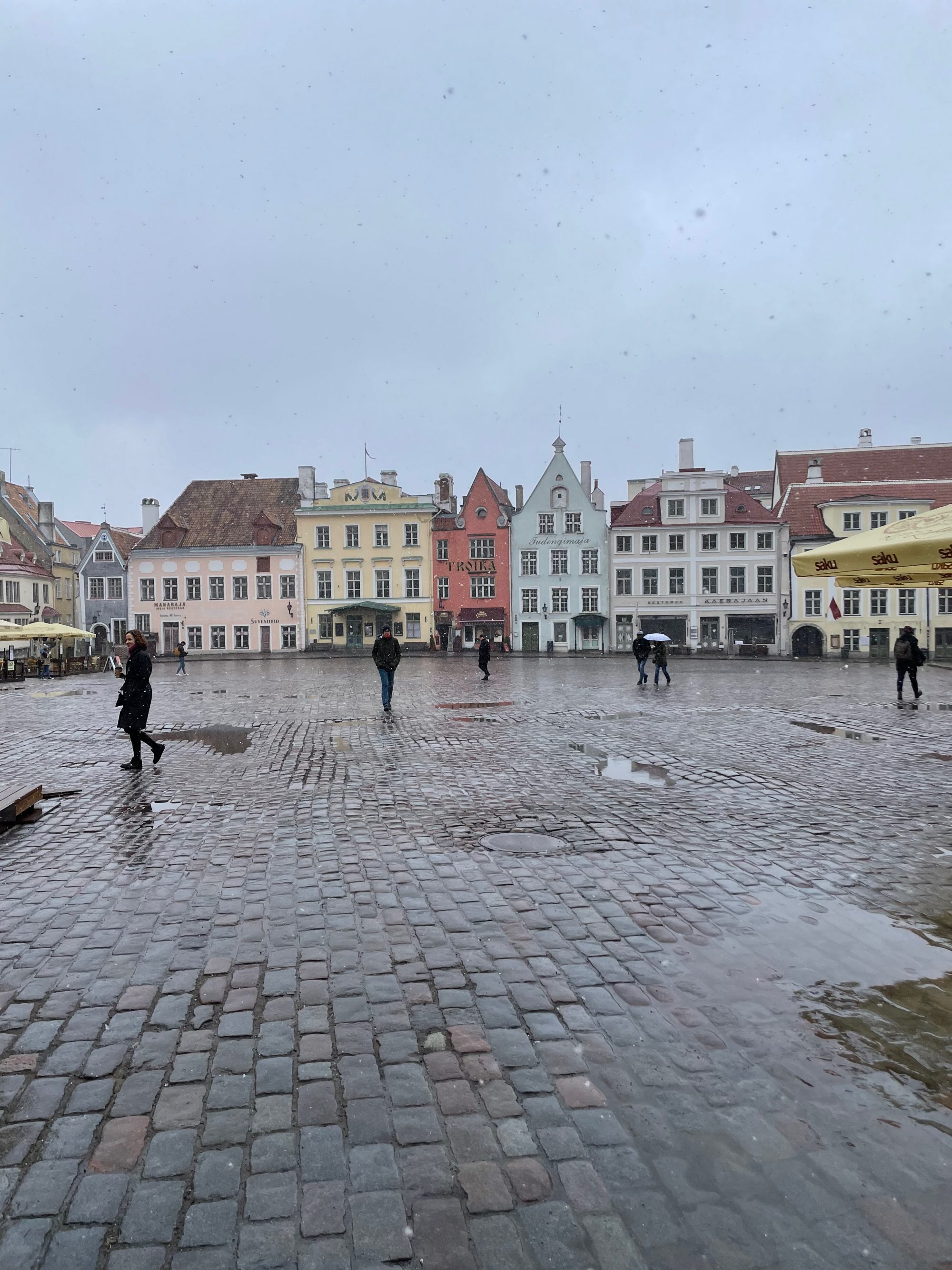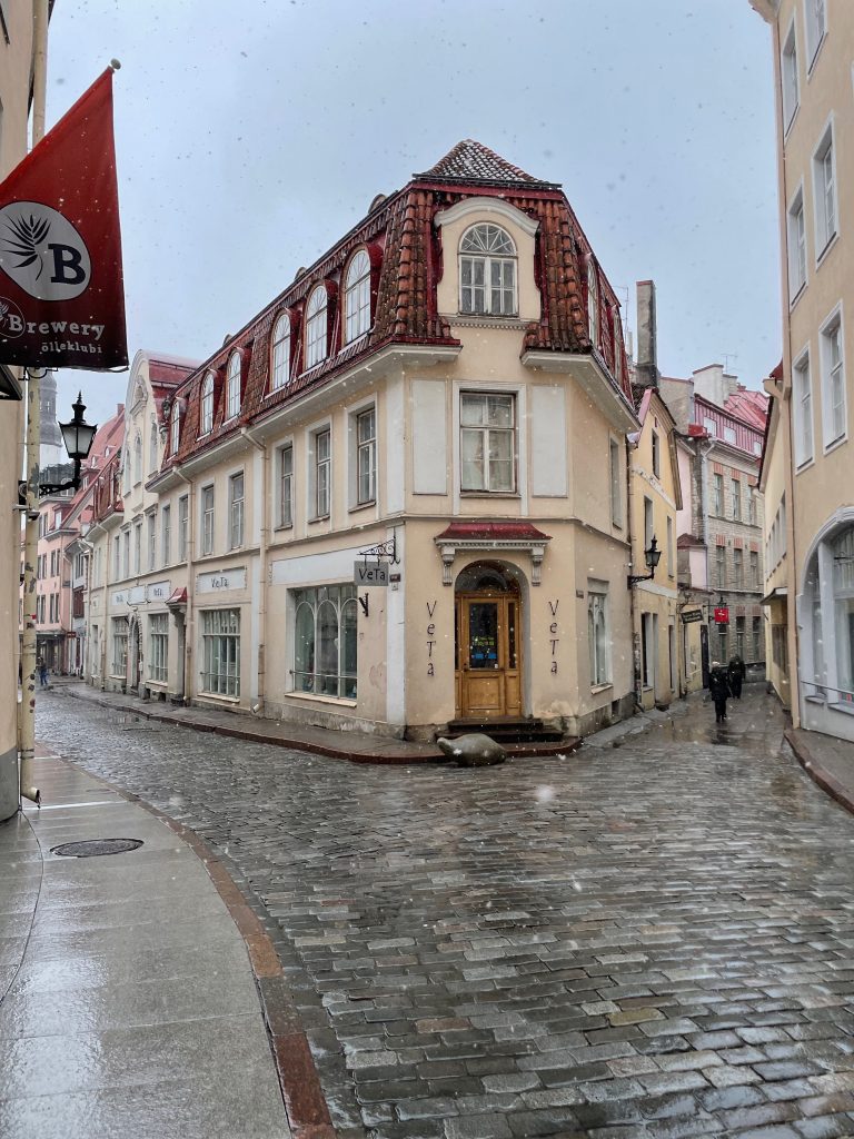 5.4.22 Der Tag begrüßte uns mit Schneeregen, welcher sich über den Tag in einen Schneesturm verwandelte. Es war schwer seinen Kopf zu heben und sich die gut erhaltene Altstadt Tallinns anzusehen. Wir starteten den Rundgang am Rathaus und wollten danach zur Aussichtsplattform gehen. Auf dem Weg kamen wir an der Alexander-Newski-Kathedrale, dem Parlament und dem Dom von Tallinn vorbei. Dann kamen wir zur Plattform und man sah…. , nichts. So machten wir uns wieder in die Innenstadt zurück, stöberten durch ein paar Souvenirläden und landeten schlussendlich im Café Maiasmokk, dem ältesten Café Estlands (seit 1864). Nach diesem kalten und windigen Stadtbesuch zogen wir uns in die Emma zurück und fuhren noch 20 Minuten bis zu unserem Schlafplatz.