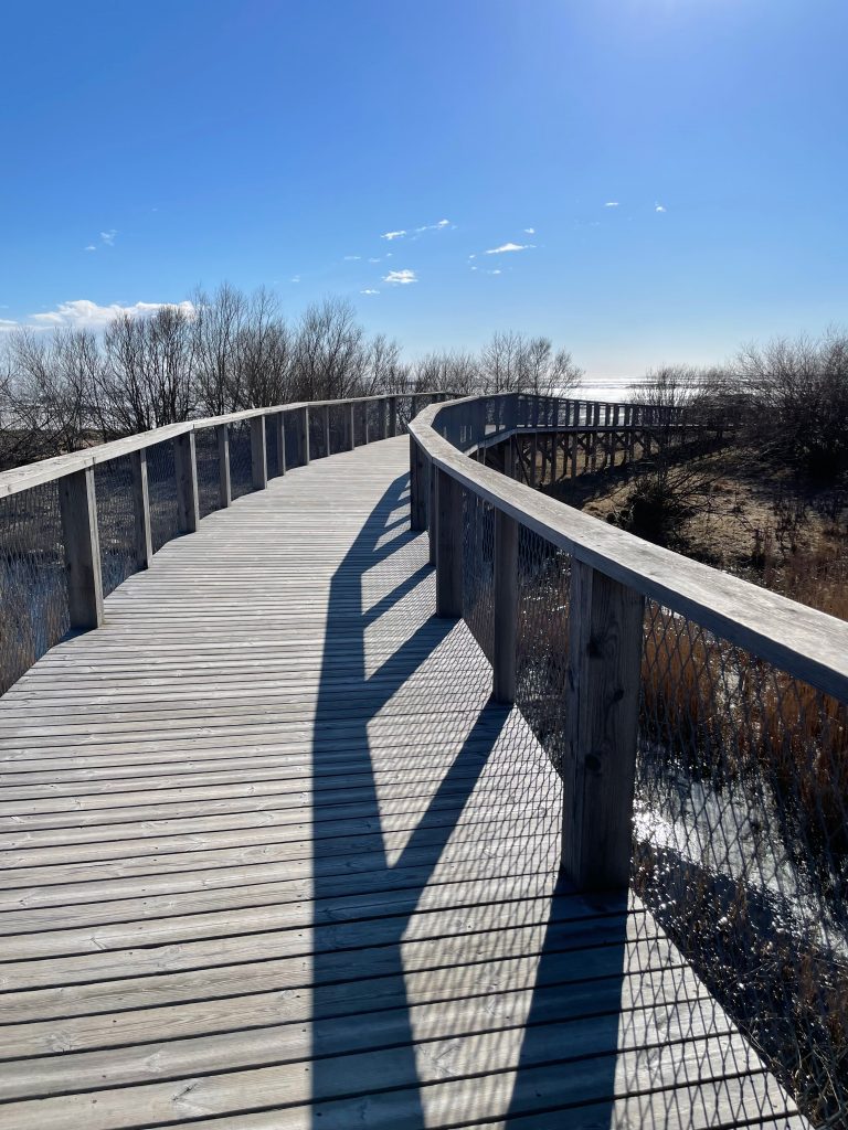 9.4.22 Bei starkem Gegenwind liefen wir als erstes zu einem Aussichtsturm am Strand, von dort konnte man das Wasser sehen, welches immer noch zugefroren war und sich zu Eisbergen aufgetürmt hatte. Danach fuhren wir zu einem Campingplatz, um zu duschen, freundlicherweise mussten wir nicht einmal etwas bezahlen. Dann wieder zurück nach Pärnu, wo wir uns die Innenstadt ansahen und auf einem Steg im Moor spazieren gingen.