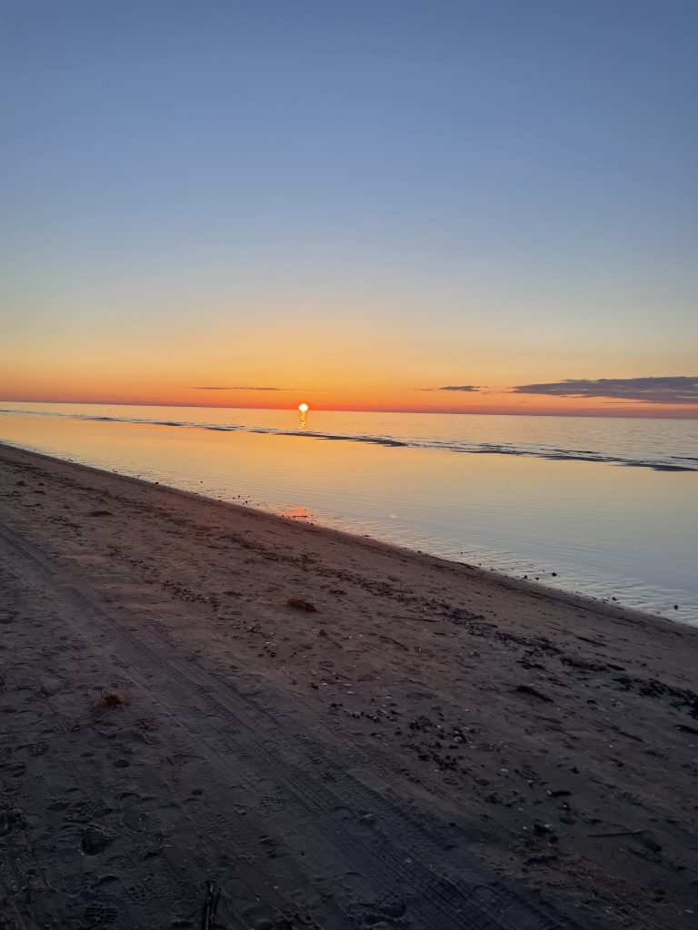 22.4.22 Wir fuhren an diesem sonnigen Tag die zweite Hälfte der Strecke an das Kap Kolka. Das Kap bot uns die ruhige Ostsee und einen ausgedehnten Spaziergang. Um circa halb neun gingen wir an die Ostsee und bewundertem bei ruhiger See und lauem Wind einen wirklich funkelnd strahlend schönen Sonnenuntergang.