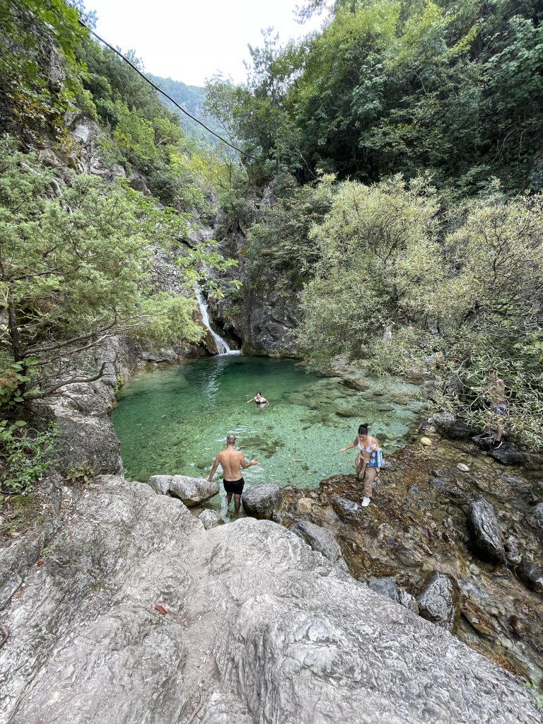 17.9.22 Ganz in der Nähe unserer Schlafplatzes konnten wir am Mittag wilde Flamingos beobachten. Dann fuhren wir weiter in Richtung Olymp und zum Orlias Bach, einem Gebirgsfluss, der in verschiedenen Wasserfällen und natürlichen Pools mündet. Wir nahmen ein Bad und ließen die Kälte des Wassers auf uns wirken.