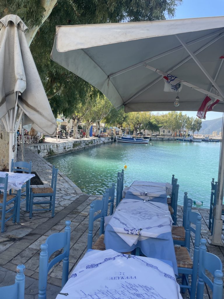 25.10.22 Die zweitgrößte Stadt Lefkadas ist Vasiliki im Süden der Insel. Dort tranken wir gemütlich einen Kaffee, danach fuhren wir weiter zum südlichsten Spitze, auf welcher ein Leuchtturm thront.
